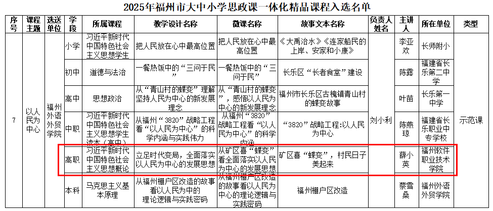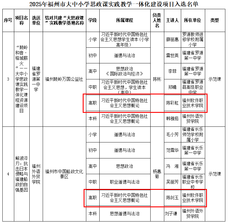 根据《福州市教育局关于开展全市大中小学思政课一体化建设项目申报工作的通知》(榕教思〔2025〕13号),经单位推荐,市教育局组织评审、公示,我校马克思主义学院陈彩虹、陈剑玉、薛小英3位教师成功入选全市大中小学思政课一体化建设项目名单,实现优秀教学团队、实践教学示范课、精品课程示范课三大类别全方位突破。
