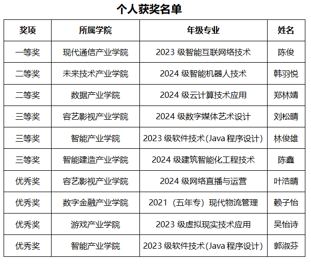 决赛参照省级赛制模式,采取积分制,设置必答题、抢答题和风险题三轮竞技环节。选手们以扎实的知识储备、敏捷的现场反应展开激烈角逐。经过三轮比拼,现代通信产业学院陈俊等6位同学分获一、二、三等奖,容艺影视产业学院叶浩晴等4位同学荣获优秀奖;现代通信产业学院6个学院分获一、二、三等奖集体荣誉。