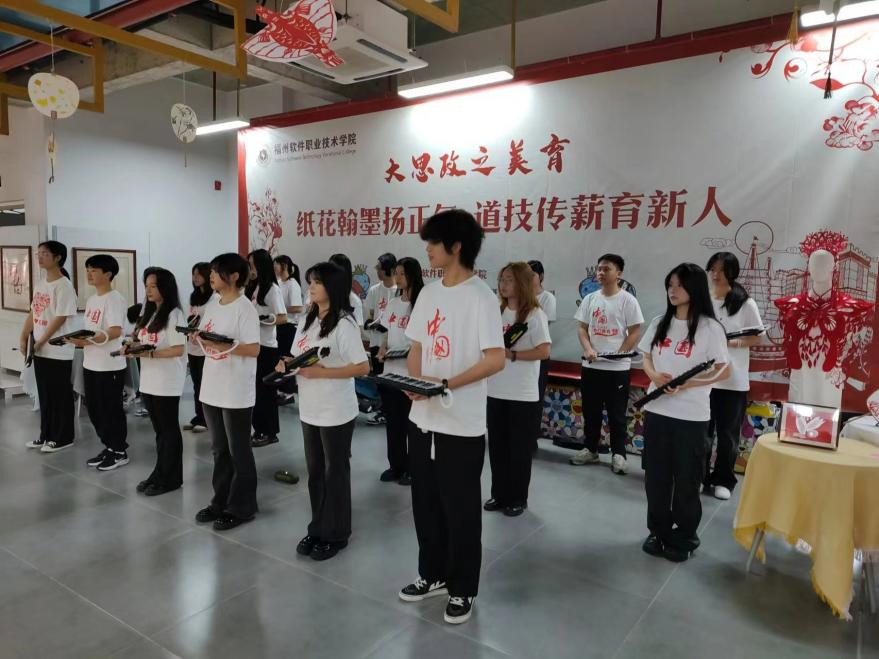 在我校开展职业教育活动周之际,马克思主义学院积极推进技能化美育教学改革,将传统剪纸艺术、书法、国画、乐器等艺术门类的技能操作及艺术鉴赏为主要内容,全面推进美的素养和审美能力养成,突显美育技能教学成果,也体现近年来我校大思政建设的显著成效。5月13日,我院在图书馆5楼展厅举办了以“纸花翰墨扬正气,道技传薪育新人”为主题的大思政美育专项成果展。本次展览共展出师生剪纸作品48幅、书画作品15幅、剪纸文创产品10款,以及现场乐器演奏及合唱等表演内容。