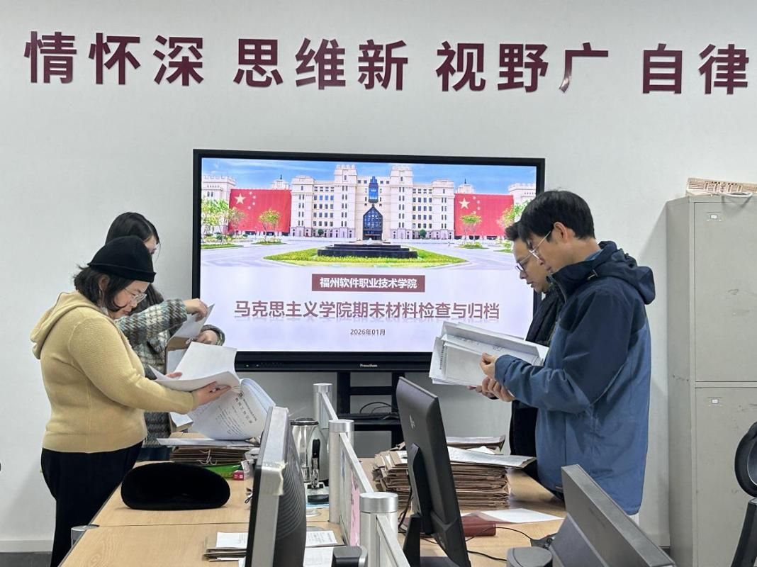 1月26日上午,我院组织开展了2025-2026学年第一学期期末教学材料检查与归档专项工作。学院副院长叶镇国、各课程教研室主任组成督导组,对本学期所开设的《思想道德与法治》《毛泽东思想和中国特色社会主义理论体系概论》《国家安全教育》及《形势与政策》各课程归档资料开展全面自查,严把教学管理质量关。